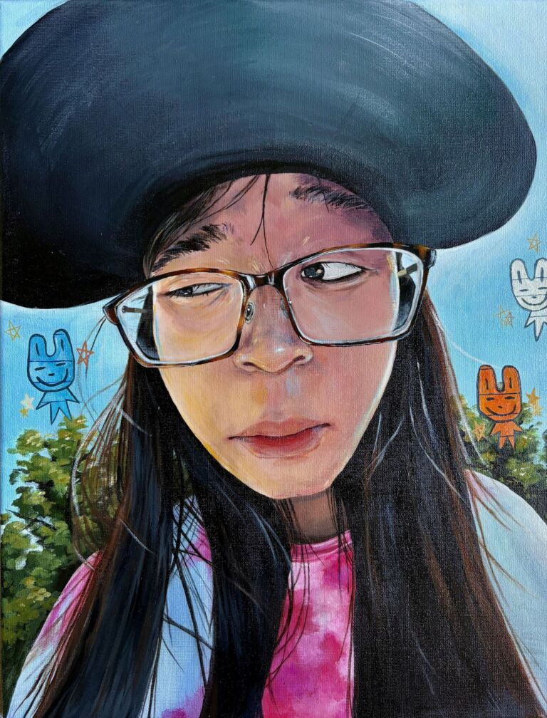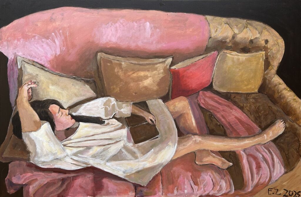 Ethan Zheng, Dreams between the pages, acrylic on canvas, 69 x 96 cm. Year 7, Vermont Secondary College, VIC.